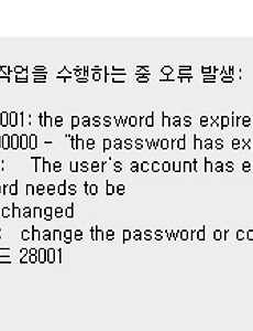 DataBase/ORACLE1 ORA-28001 : the password has expired (패스워드 만료) SQL Developer에서 접속 오류와 함께 the password has expired라는 오류 메세지가 나타났습니다. 이를 해결하기 위해서는 sqlplus를 이용하여 패스워드를 해결할 수 있습니다. 1.CMD창 열기2.sqlplus 접속 - sqlplus conn as sysdba3.(설치시)비밀번호 입력4.사용자 변경- alter user scott account unlock;5.암호 변경- alter user scott identified by dbtest; 6.접속확인- Oracle SQL Developer에 접속하여 바꾼 비밀번호(:dbtest)를 입력하고 해당 계정이 잘 접속되는지 확인합니다. 2018. 10. 28. 이전 1 다음